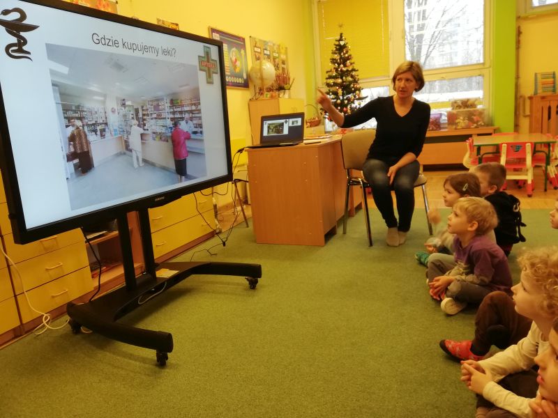 W grudniu, grupę Misiów Pocopotków odwiedziła mama Piotrka, która przybliżyła dzieciom zawód farmaceuty i charakter pracy w aptece.                                                                                 Opowiedziała przedszkolakom, co należy do zadań farmaceuty zatrudnionego w aptece – realizowanie recept, sprzedaż produktów medycznych i leków gotowych.  Pani farmaceutka wytłumaczyła naszym milusińskim, czym są tabletki i jakie są ich rodzaje, co to są kapsułki, maście, syropy, krople i zastrzyki. Podkreślony został fakt, że leki można przyjmować tylko jeśli jest się chorym i pod opieką dorosłych. Dzieci dowiedziały się także jak wygląda i do czego służy recepta. W trakcie spotkania dzieci były aktywne i zadawały dużo pytań. Dziękujemy za ciekawe spotkanie.