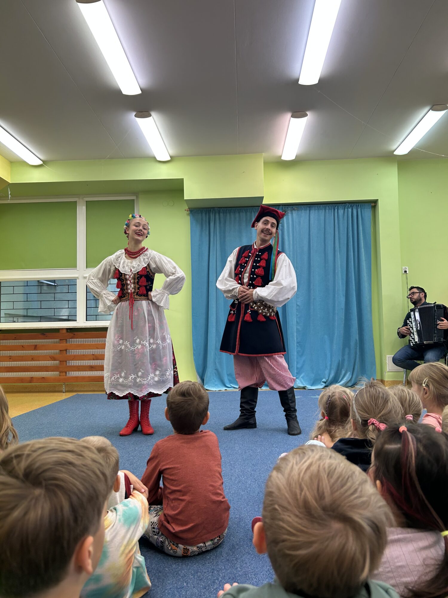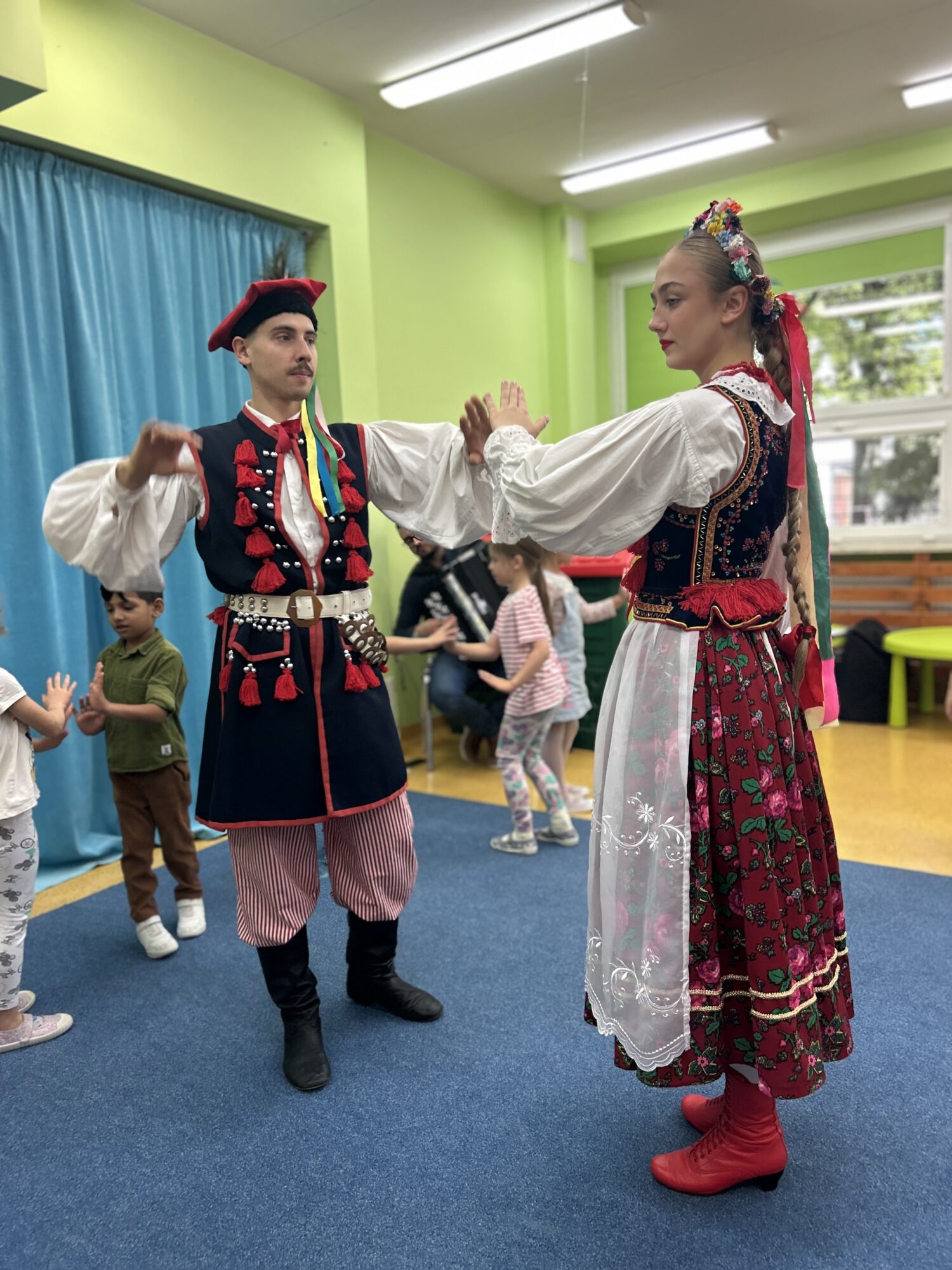 Wydarzenie było okazją do poznania jednej z najbardziej charakterystycznych tradycji naszego kraju – tańca krakowskiego, pełnego energii, żywiołowej muzyki oraz kolorowych strojów ludowych. Dzieci z ogromnym zainteresowaniem oglądały pokaz, a niektóre z grup miały nawet okazję spróbować własnych sił na parkiecie!