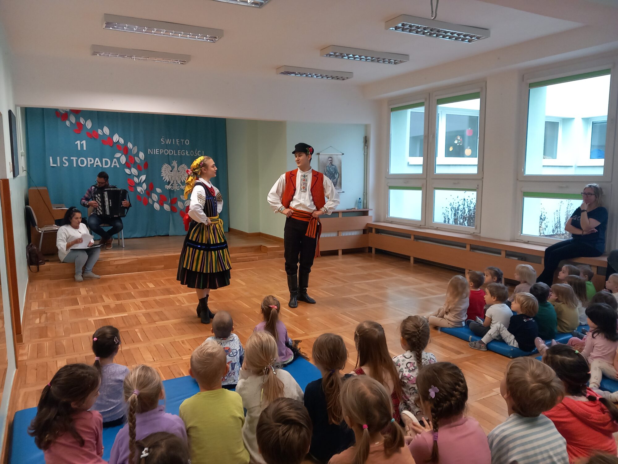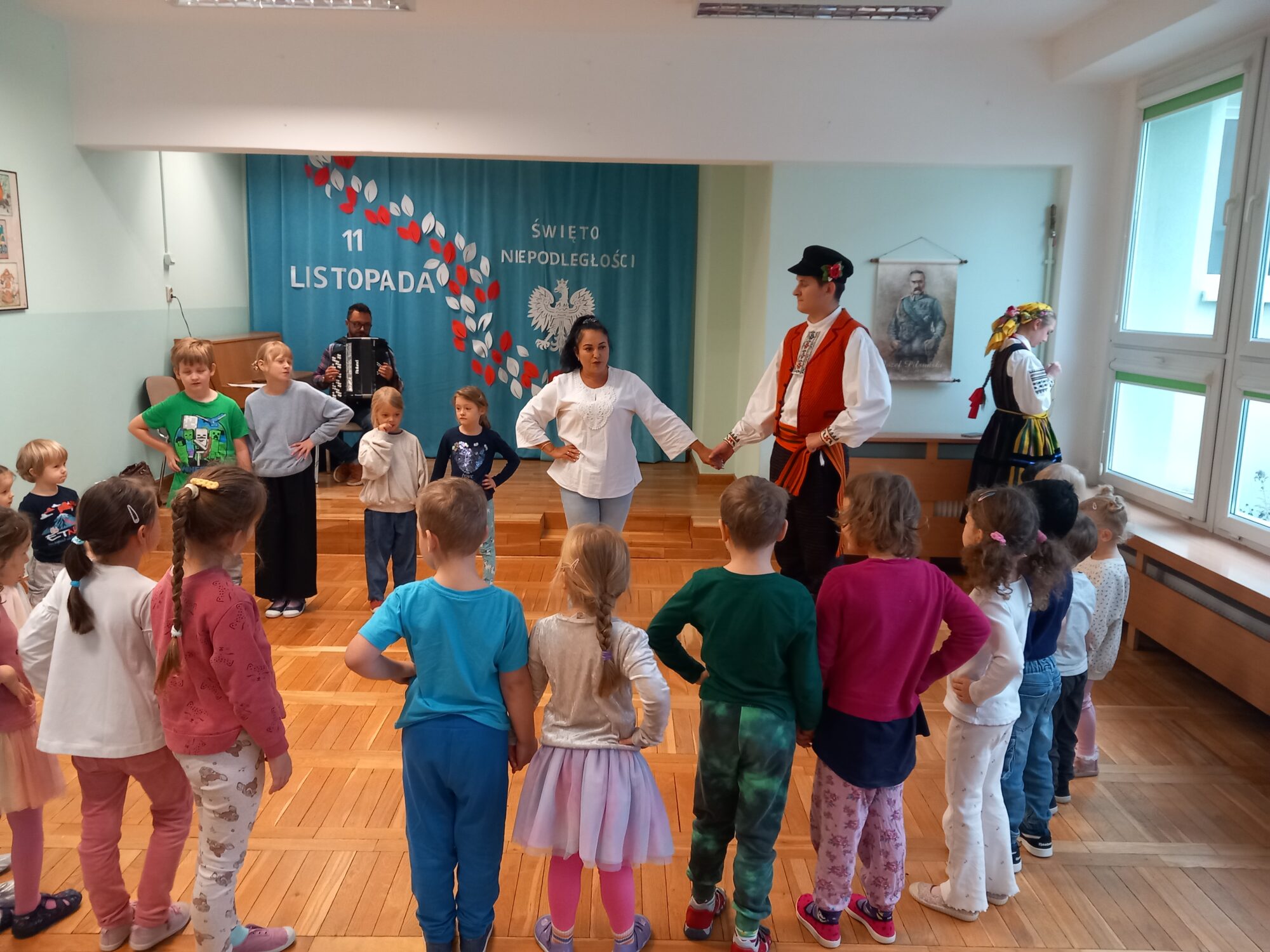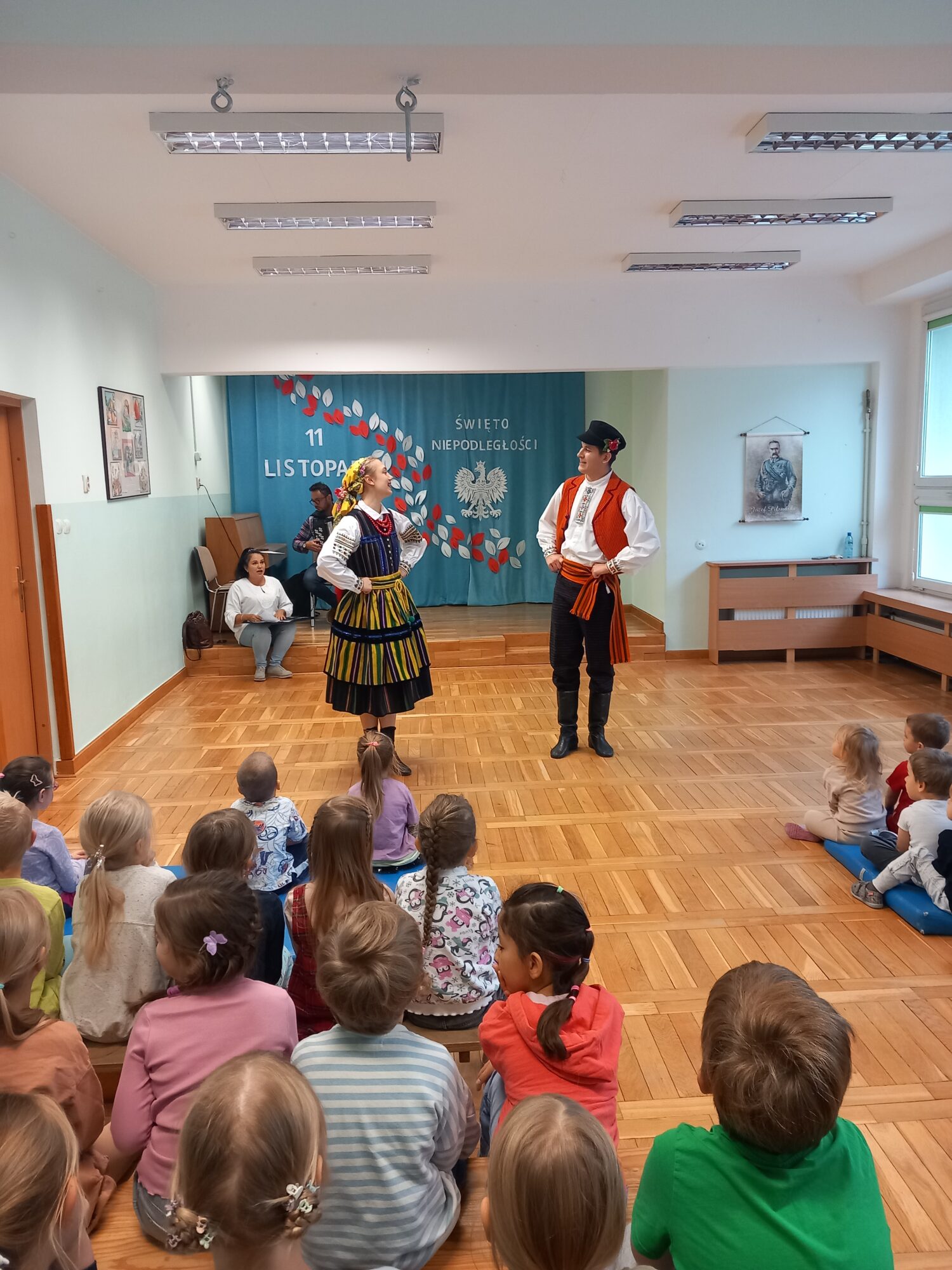 Wydarzenie rozpoczął barwny występ taneczny, który wprowadził wszystkich w radosny, ludowy nastrój. Dzieci zapoznały się z tradycjami związanymi z Andrzejkami. Po pokazie na scenę zaproszono dzieci, które z ogromnym entuzjazmem włączyły się do wspólnej zabawy i tańców.