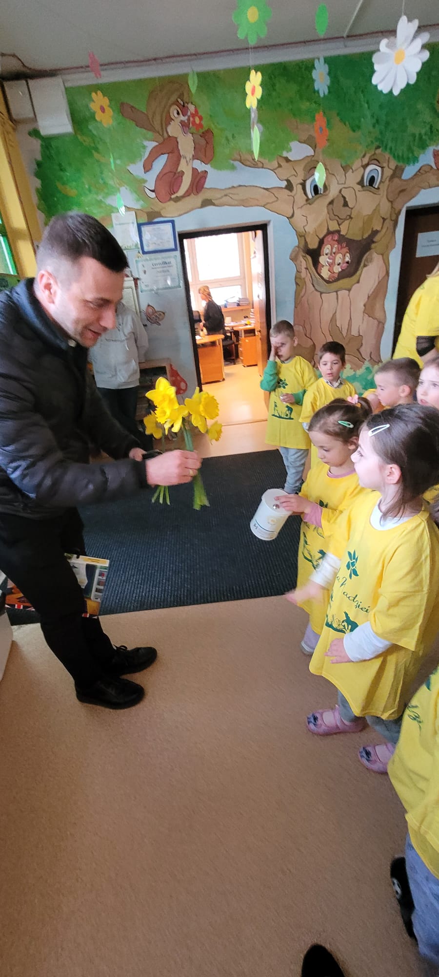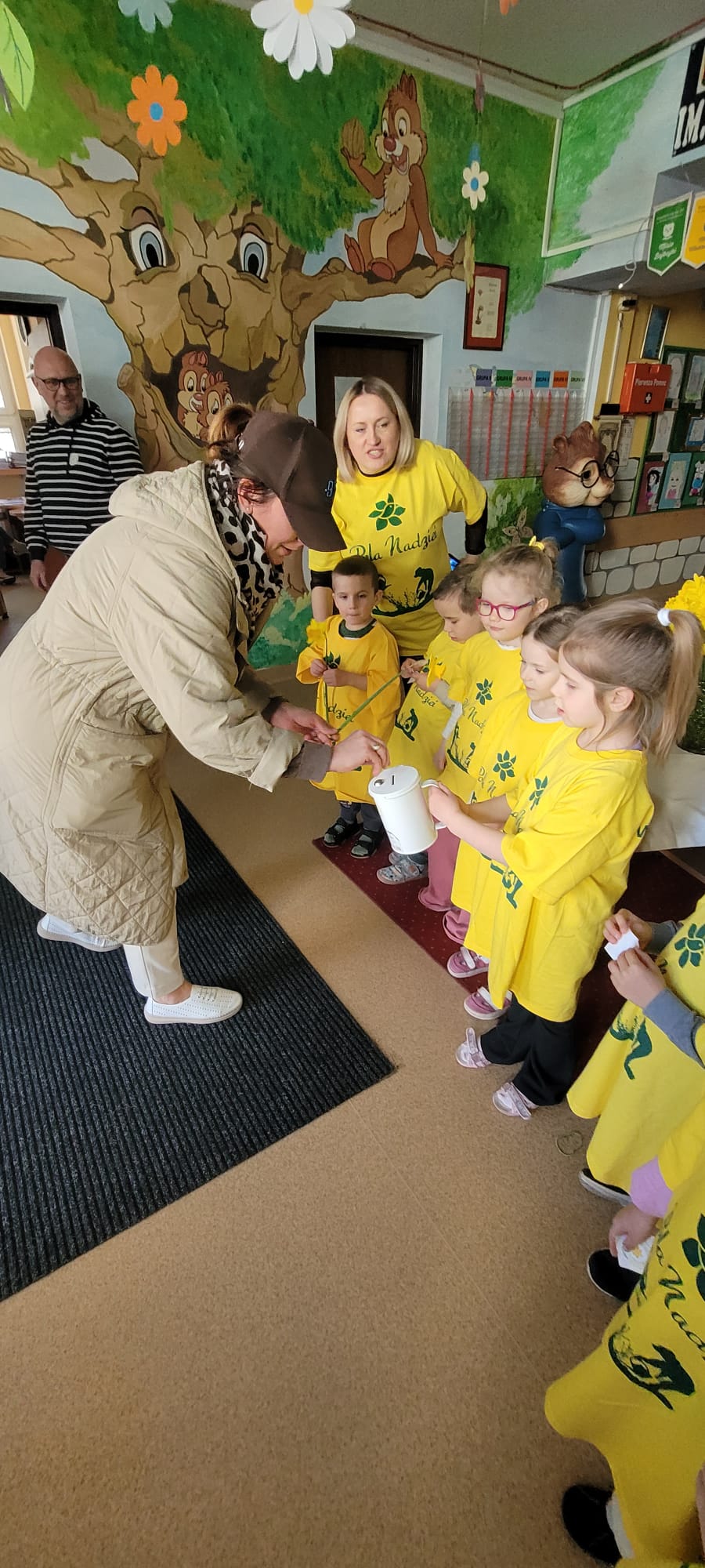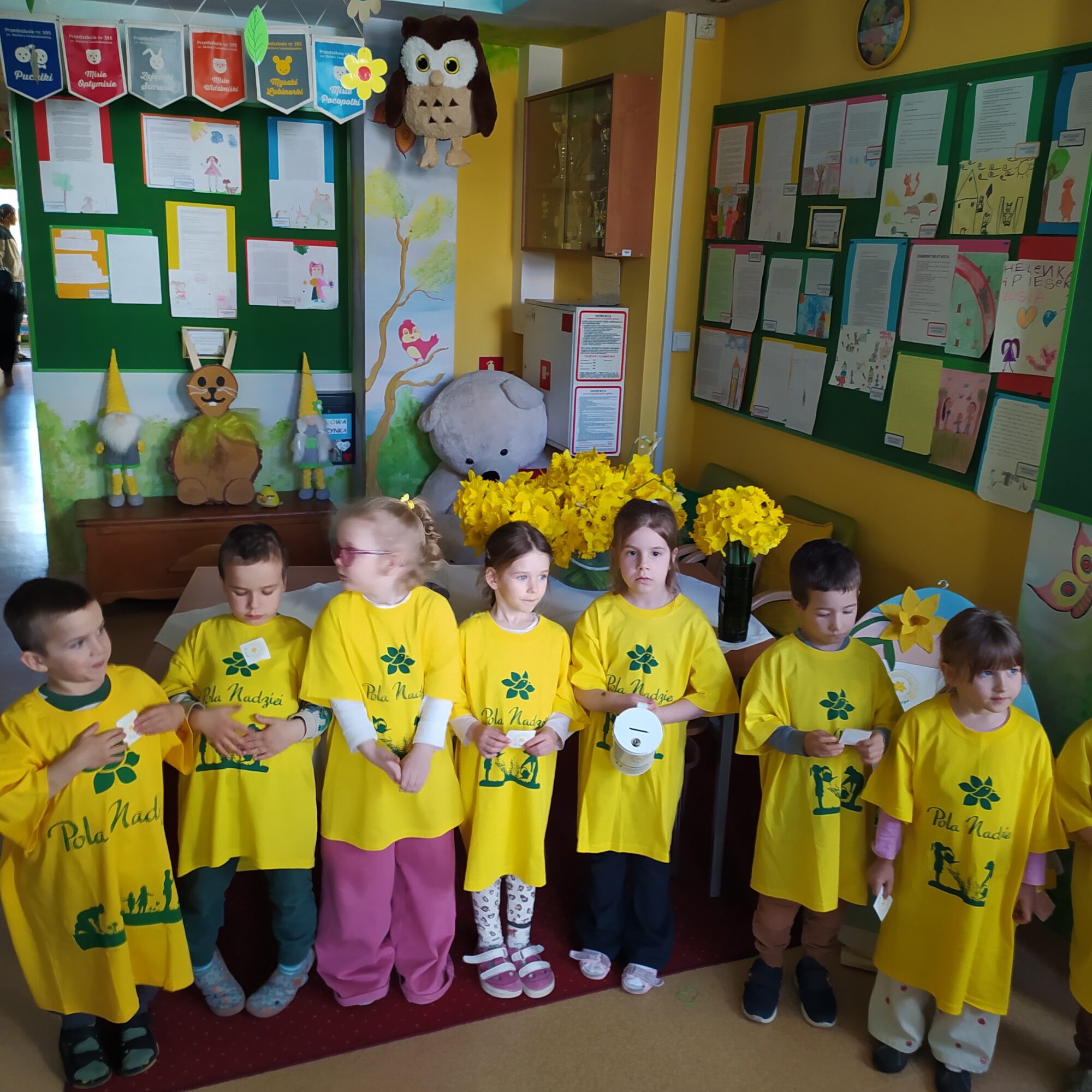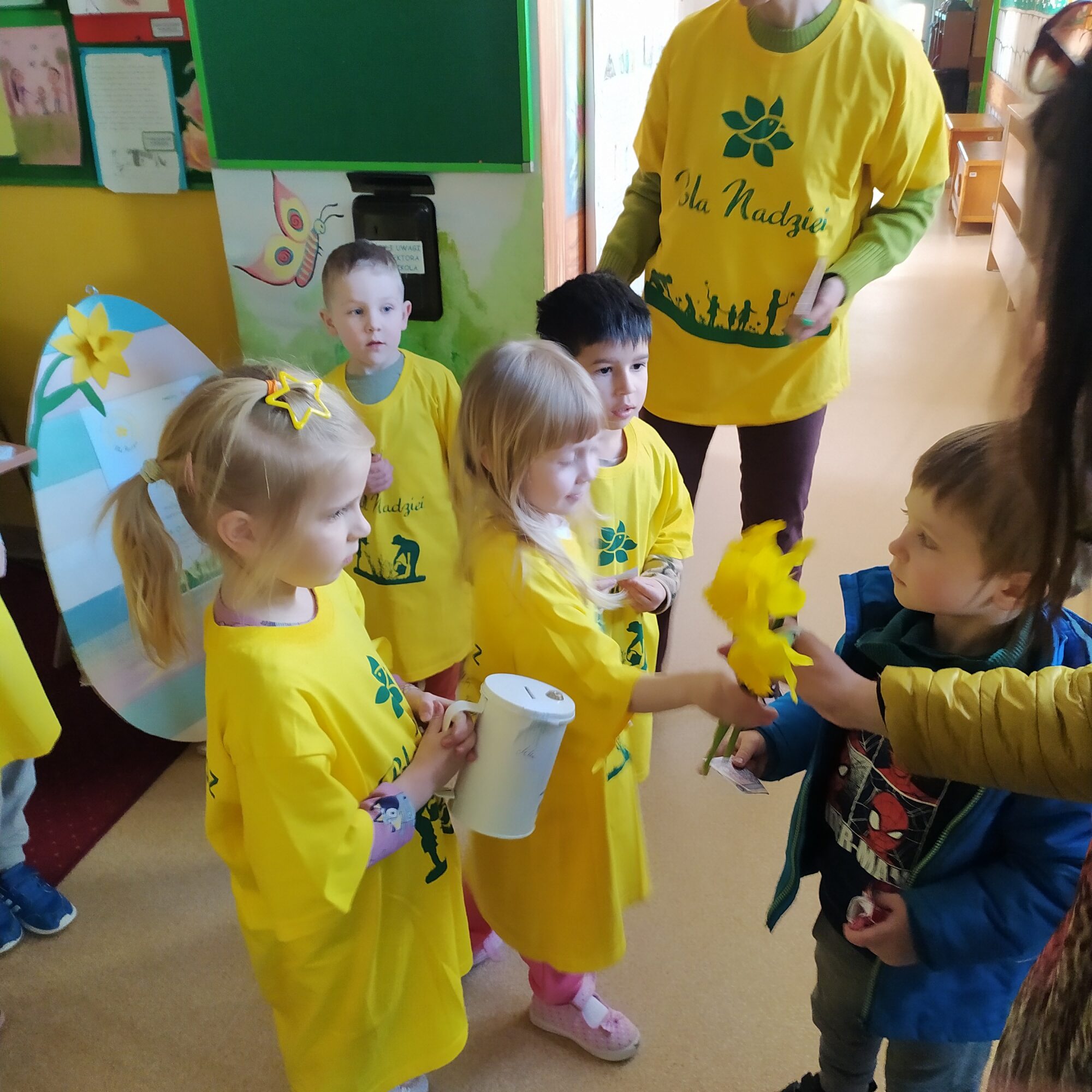 Mali wolontariusze kwestowali na terenie przedszkola wręczając żonkile- symbol nadziei i solidarności z osobami chorymi.