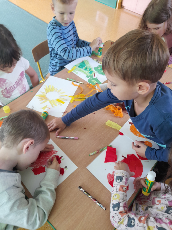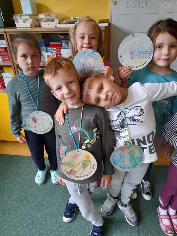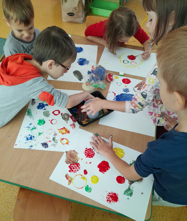 W tym roku realizujemy ciekawe projekty, takie jak „Edukacja medialna”- zapoznajemy się z techniką, uczymy się bezpiecznie korzystać z urządzeń multimedialnych. Projekt „Zabawa sztuką” rozwija w nas kreatywność, pozwala myśleć nieszablonowo, bawić się sztuką. A jesteśmy bardzo kreatywni! Dzięki projektowi „Bajki Pomagajki” mamy kontakt z literaturą, rozmawiamy o emocjach, poruszamy ważne tematy, które nas dotyczą. Podczas codziennych zajęć rozwijamy wszechstronnie język angielski, który bardzo lubimy i chcemy jeszcze lepiej poznać, dzięki rozmaitym pomocom dydaktycznym i zaangażowaniu naszej Pani. Tworzymy wspólnie album pt. „Moje ulubione miejsca w Polsce”, aby lepiej poznawać nasz kraj i rówieśników. W naszej grupie wykonaliśmy „Pudełko dobrych uczynków”, które „dokarmiamy” ilustracjami z dobrymi uczynkami, wspólnie omawiamy, a to uczy nas empatii i szacunku w stosunku do innych. Posiadamy w sali dobrze zaopatrzoną biblioteczkę, z której często korzystamy, sami też lubimy przynosić ciekawe książki. Uważnie słuchamy, gdy panie nam czytają, przeglądamy strony z ilustracjami, dokonujemy próby samodzielnego czytania oraz wypożyczamy książki do domu. Będziemy także w tym roku uczęszczać na zajęcia biblioteczne. Podobnie jak w ubiegłych latach uczestniczymy w akcjach humanitarnych, tj. ,,Pola Nadziei”, ,,Dzień Chorego”- na rzecz hospicjum oraz zbiórce karmy i artykułów dla zwierząt ze schroniska. Przed nami spotkania z cyklu „Rodzic Ekspert” czy „Cała Polska czyta dzieciom”, do których serdecznie zachęcamy rodziców. W naszej sali mamy też rozmaite pomoce np. plansze do nauki kodowania, gry planszowe, szachy, monografie liter – bo przecież jesteśmy sześciolatkami i niedługo wybieramy się do szkoły! Ponadto codziennie śpiewamy, bo lubimy to robić, gimnastykujemy się, by poprawić naszą kondycję fizyczną, a poza tym, chcemy być zdrowi. Jednak to, co jest dla nas najważniejsze przez te wszystkie lata spędzone w przedszkolu, to możliwość wspólnych zabaw z rówieśnikami, poznawania siebie nawzajem. Jesteśmy pewni, że ten ostatni rok w przedszkolu przyniesie nam jeszcze wiele ciekawych i niezapomnianych chwil.
